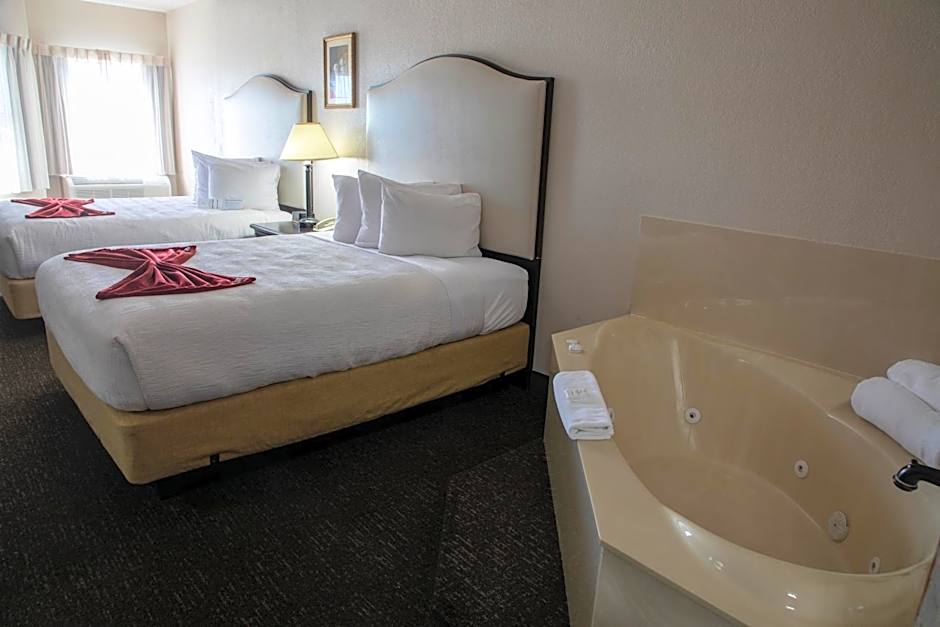 Room options span a range of styles, including King Room with Jetted Tub, Deluxe King, Queen Room, Studio, and Suite variants (such as Suite with Jetted Tub and Executive Suite with Jetted Tub), plus balcony-equipped and multi-queen configurations. Payment options include Mastercard, American Express, and Visa, with cash not accepted.